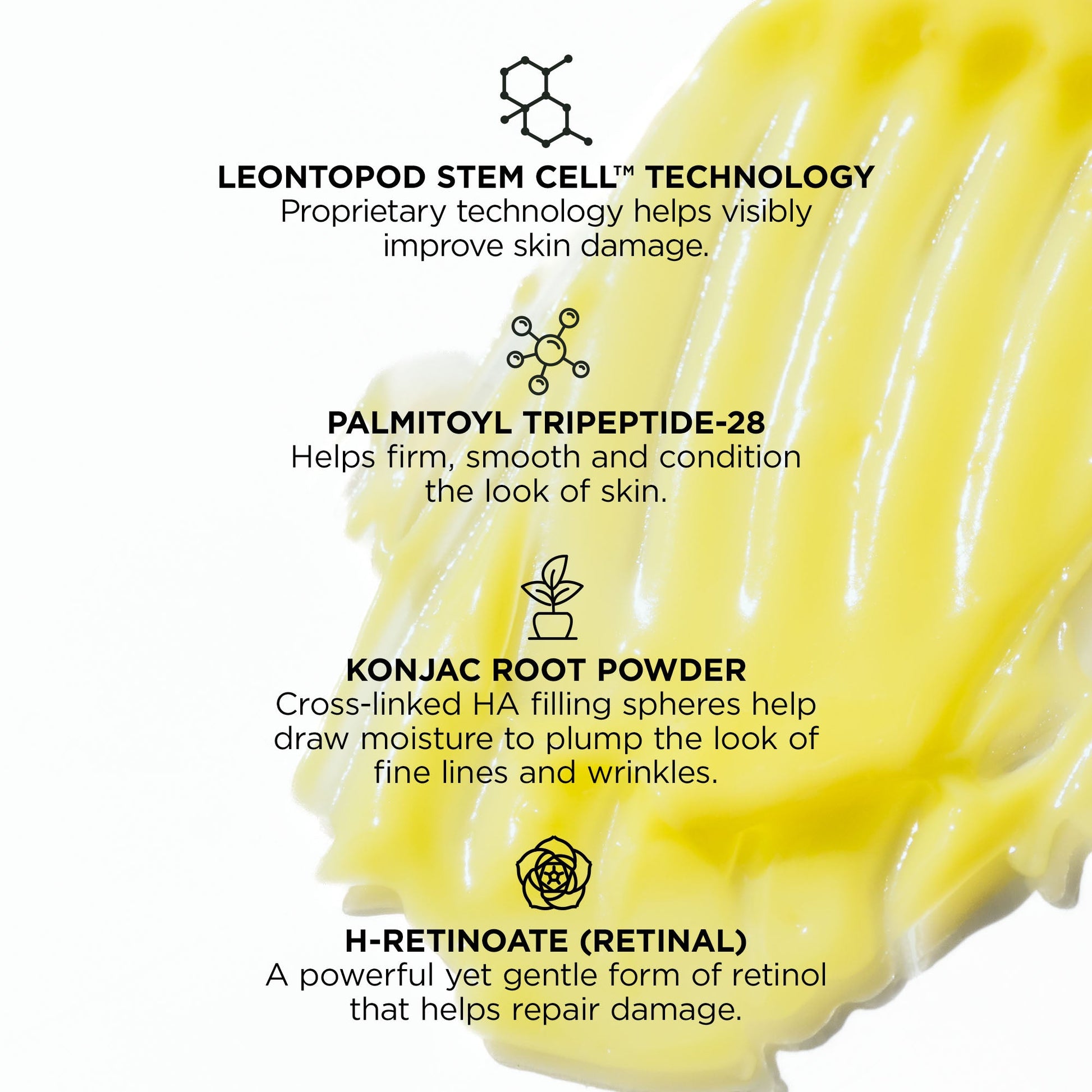 A non-irritating overnight treatment formulated with non-drying, deep-release retinol (vitamin A) to help visibly firm skin, fade the look of fine lines and smooth texture without the harsh side effects. This powerhouse repair serum is enhanced with hydrating cross-linked Hyaluronic Acid filling spheres to boost moisture levels for a consistent, youthful-looking glow.