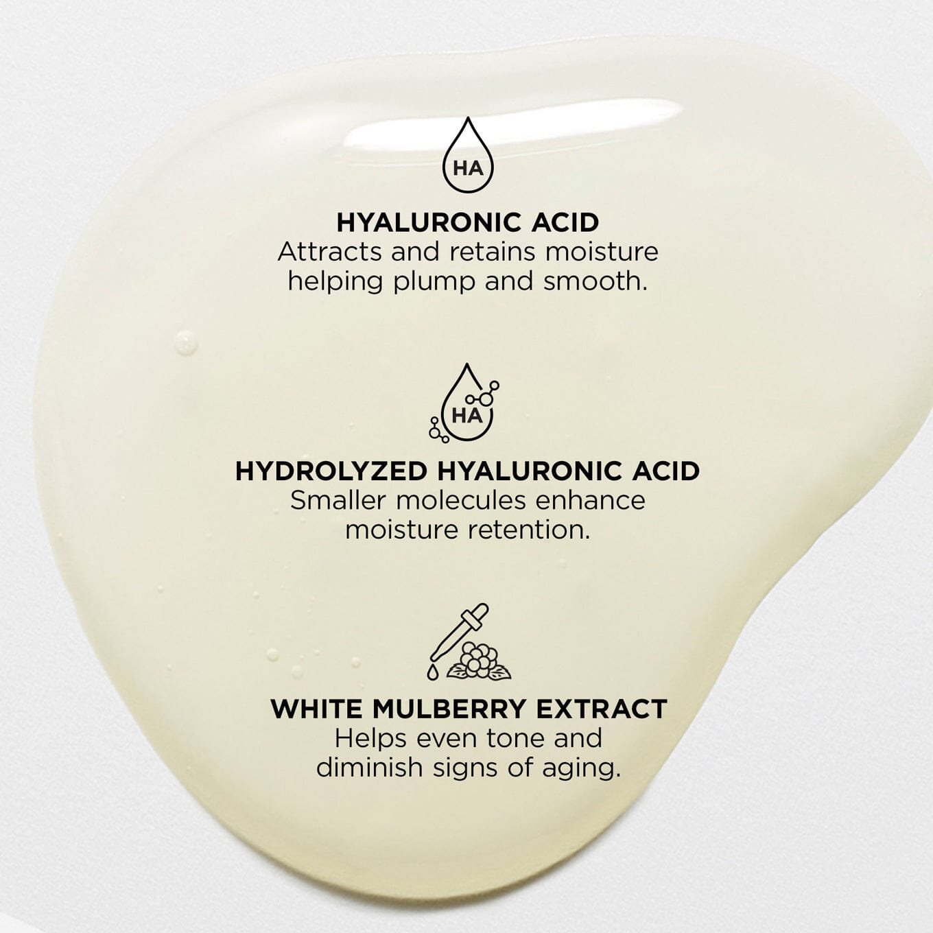 Supercharged with a hydrating blend of five molecular weights of Hyaluronic Acid and powerful antioxidants, this concentrated formula deeply treats and targets hydrates the skin from the inside out. Soothing Mulberry Extract and HA deliver plumper-looking skin while smoothing the appearance of fine lines and wrinkles for a more radiant complexion in seconds. Inject into your moisturizer, serum or foundation and instantly turn them into an anti-aging powerhouse - just inject, cocktail, and plump.